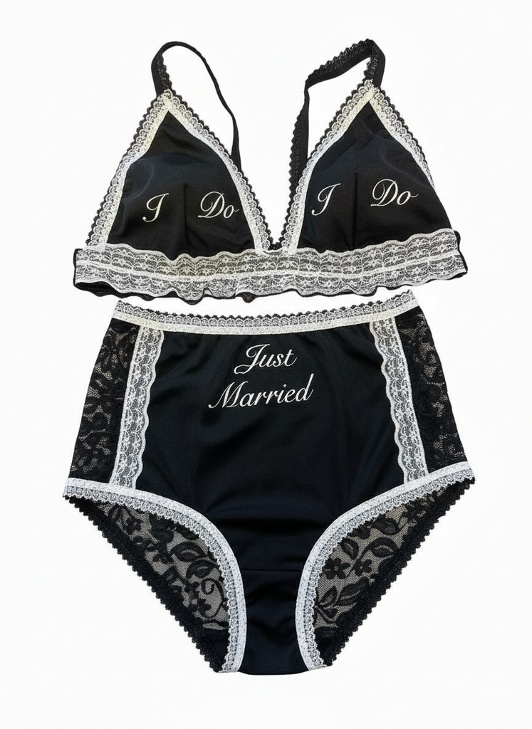 Stretch white velvet & lace base High waisted panties with “JUST MARRIED” vinyl on the belly